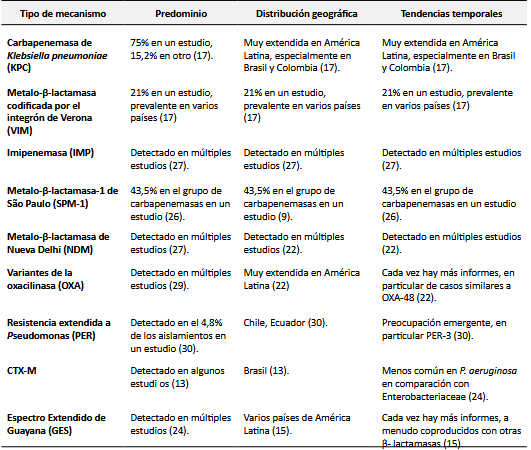 Se describieron 5 mecanismos (KPC, VIM, NDM, variantes OXA, GES) como generalizados o encontrados en varios países de América Latina (17, 14, 22, 15).