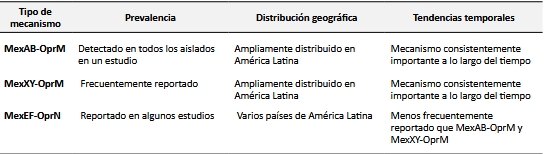 Entre los mecanismos de resistencia estudiados en Pseudomonas aeruginosa en América Latina, los sistemas de bombas de eflujo han demostrado ser relevantes, aunque la información cuantitativa específica sobre su prevalencia y distribución geográfica es limitada. Según los estudios revisados, se encontró información sobre cuatro mecanismos de bomba de eflujo en Pseudomonas aeruginosa en América Latina: