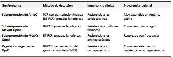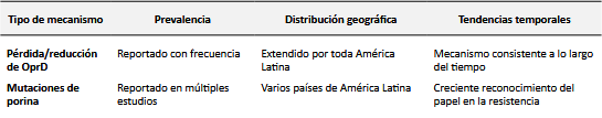 En cuanto a los mecanismos de resistencia asociados a alteraciones en la permeabilidad de la membrana de Pseudomonas aeruginosa, la pérdida o reducción de la porina OprD fue reportada con frecuencia y está considerablemente extendida por toda América Latina, y se mantiene como un mecanismo consistente a lo largo del tiempo (11,31). Asimismo, las mutaciones en porinas fueron detectadas en múltiples estudios y en varios países de la región, con un creciente reconocimiento de su papel en la resistencia a los antibióticos.