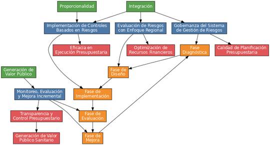 El modelo teórico conceptual propuesto en la figura 1, establece una relación sistémica entre la gestión de riesgos en la implementación del control previo y la eficiencia en la gestión presupuestaria hospitalaria. Parte del principio de que un enfoque adaptativo del control previo, basado en la gestión de riesgos, optimiza el equilibrio entre el rigor en el resguardo de recursos públicos y la agilidad operativa que requieren los hospitales. Se fundamenta en tres principios: proporcionalidad, donde la intensidad del control se ajusta al nivel de riesgo de cada operación presupuestaria (10); integración, que implica incorporar la gestión de riesgos en todos los procesos presupuestarios (9), y generación de valor, orientando el control previo a la obtención de resultados sanitarios y satisfacción ciudadana, más allá del mero cumplimiento formal (1)