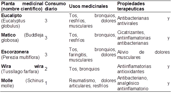 Respecto a la frecuencia de uso, se observó que el eucalipto, el matico y la escorzonera fueron las plantas más utilizadas diariamente (tres veces al día), seguidas por la wira wira (dos veces al día) y el molle (una vez al día). Esta regularidad en el consumo demuestra un hábito constante en la automedicación tradicional de la población.