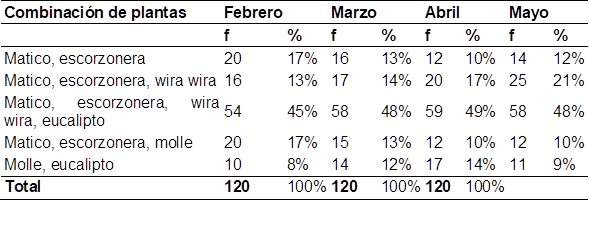 En el mes de febrero, el 45% de los encuestados indicó consumir dicha combinación de plantas, mientras que otras mezclas como molle con eucalipto solo alcanzaron el 8%. En marzo, esta misma combinación de cuatro plantas aumentó al 48%, reflejando una intensificación del uso durante la temporada invernal. En abril se registró el mayor consumo de infusiones, con un 49% de preferencia para la combinación matico, escorzonera, wira wira y eucalipto. Finalmente, en mayo, la proporción se mantuvo alta, con un 48%, lo cual sugiere que los pobladores continuaron confiando en la eficacia de esta mezcla incluso al disminuir la intensidad del clima frío.