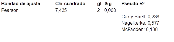 Los resultados de la prueba de bondad de ajuste y el coeficiente pseudo R² se presentan en la Tabla 4.