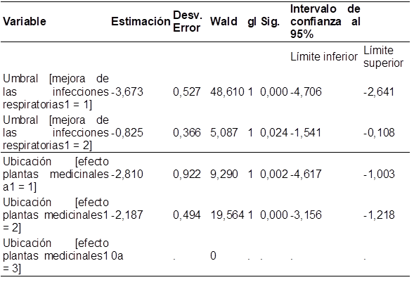 De acuerdo con el valor del estadístico Wald (19,564), que fue mayor al valor crítico de 4, y un valor de significancia p = 0,000 menor que el nivel α = 0,05, se rechazó la hipótesis nula y se aceptó la hipótesis alternativa. Esto confirmó que el uso de plantas medicinales tuvo efectos positivos y significativos en la mejora de las afecciones respiratorias de los pobladores en la provincia de Sihuas, Ancash.