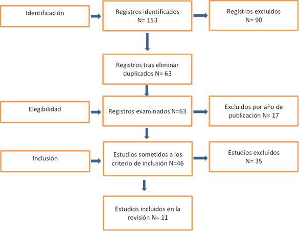 El proceso de selección se desarrolló conforme a las cuatro fases del diagrama de flujo PRISMA: identificación, cribado, elegibilidad e inclusión. Inicialmente, se identificaron 153 registros provenientes de bases de datos y otras fuentes, de los cuales 90 fueron excluidos por no cumplir con los criterios generales. Posteriormente, se eliminaron los duplicados, quedando 63 registros para su revisión. En la etapa de elegibilidad, se examinaron estos 63 registros, excluyendo 17 por no corresponder al año de publicación requerido. Los 46 estudios restantes fueron sometidos a los criterios de inclusión específicos, de los cuales 35 fueron excluidos por no cumplir con los requisitos metodológicos y temáticos. Finalmente, se incluyeron 11 estudios en la revisión sistemática, los cuales aportaron evidencia relevante para el objetivo del estudio, Figura 1.