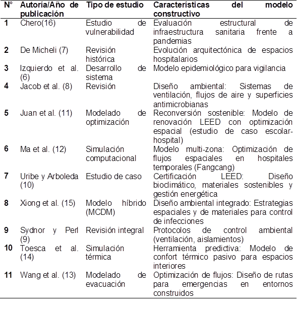 Los estudios analizados según ilustra la Tabla 1, revelan que los modelos constructivos con mayor impacto en la reducción de infecciones intrahospitalarias integran diseño ambiental avanzado y gestión estratégica de flujos. Investigaciones como las de Jacob et al. (8) y Sydnor y Perl (9) destacan que sistemas de ventilación inteligente, superficies antimicrobianas y protocolos de aislamiento son fundamentales para controlar patógenos aéreos.