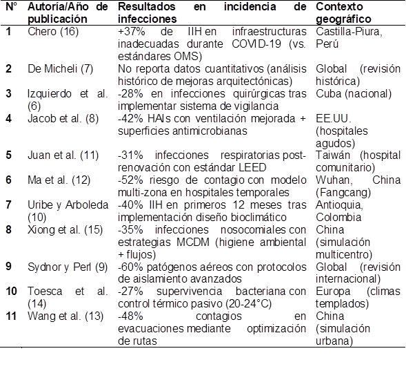 No obstante, la aplicabilidad de estos hallazgos muestra variaciones considerables según factores contextuales como la disponibilidad de recursos técnicos, la capacitación del personal y las características geográficas específicas. En este análisis, se examina la evidencia disponible mediante la evaluación de validez interna, riesgo de sesgo metodológico y viabilidad de implementación en el contexto peruano, donde estudios recientes como el de Chero (16) documentan un alarmante incremento del 37% en IIH durante la pandemia de COVID-19, atribuible principalmente a deficiencias estructurales en infraestructuras sanitarias que no incorporaron principios básicos de bioseguridad arquitectónica.