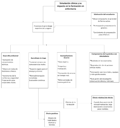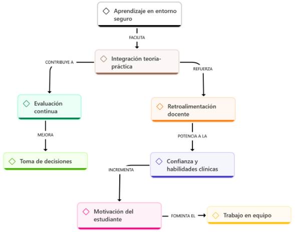 Complementariamente, se identificaron seis dimensiones que enriquecen la comprensión del fenómeno: el aprendizaje experiencial y seguro, desarrollo profesional, aprendizaje sin riesgo, acompañamiento docente, motivación del estudiante y componentes técnicos de la práctica simulada Figura 2. Estas dimensiones profundizan en aspectos específicos que influyen en la percepción estudiantil, como la importancia del realismo en los escenarios y el apoyo emocional docente.