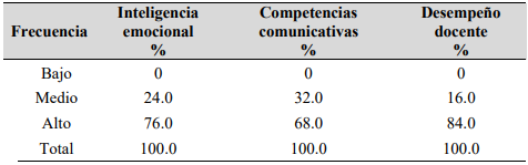 Según los datos en la tabla 1, el 76% de los encuestados consideró que la inteligencia emocional está en un nivel alto, mientras que el 24% lo califica como medio y el 0% lo consideró de nivel bajo. Los datos también mostraron que el 68% de los encuestados consideraron que las competencias comunicativas están en un nivel alto, mientras que el 32% lo calificó como medio y un 0% como bajo. Por último, el 84% de los encuestados consideraron que el desempeño docente se encuentra en un nivel alto, el 16% lo consideró en un nivel medio y nadie lo consideró en el nivel bajo. Al igual que con la inteligencia emocional y las competencias comunicativas, la mayoría de los sujetos también muestran un alto desempeño docente. Esto sugiere que aquellos con altos niveles de inteligencia emocional y competencias comunicativas tienden a demostrar también un desempeño docente positivo.
