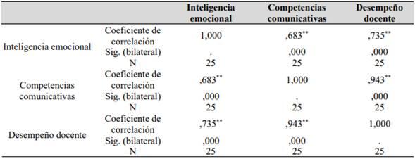 Tabla 2. Correlación de la inteligencia emocional y competencias comunicativas con desempeño docente