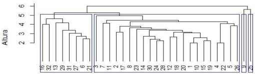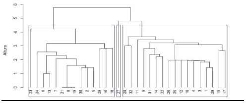 El dendrograma presentado, resultado de un análisis de clúster jerárquico utilizando el método de Ward, revela la estructura de agrupamiento de las respuestas basándose en su similitud. Se identifican dos clusters principales: el primero agrupa las respuestas 23, 24, 6, 18, 7, 21, 8, 19, 30, 5, 2, 29 y 16, mientras que el segundo incluye las respuestas 22, 20, 32, 11, 9, 31, 14, 25, 26, 12, 10, 4, 1, 3, 28, 15 y 17.