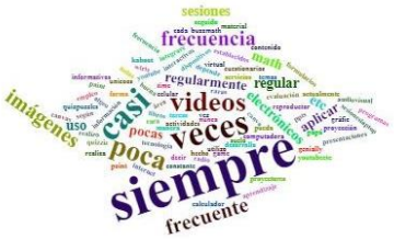 Figura 6. Nube de palabras para la pregunta ¿En qué momento de la sesión y con qué frecuencia integra las TIC?