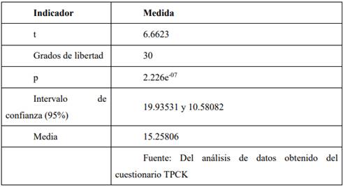 Del mismo modo la dimensión de «Conocimiento Tecnológico del Contenido» (TCK) dentro del modelo TPCK manifestó un valor t=4.964, lo cual confirma que la aplicación del modelo integra significativamente el conocimiento tecnológico del contenido en la práctica pedagógica y podría considerarse una experiencia beneficiosa para fomentar la incorporación de la tecnología en la educación. Así mismo la dimensión de «Conocimiento Tecnológico Pedagógico» (TPK) dio como resultado para el valor de t=5.1738, lo cual valida la integración de los conocimientos tecnológicos y pedagógicos en el desarrollo de las actividades de los docentes durante el proceso de enseñanza aprendizaje. En relación a la dimensión «Conocimiento Pedagógico del Contenido» (PCK) se identificó un valor t=5.9745, lo cual muestra de manera convincente que la aplicación del modelo TPCK es efectivo para mejorar el ejercicio docente mediante la integración de conocimientos disciplinares y pedagógicos.Con respecto a la dimensión de «Conocimiento Tecnológico Pedagógico del Contenido» (TPCK), se encontró un valor t=7.9084, lo cual proporciona un respaldo sólido a la hipótesis de la investigación, validando su eficacia en un entorno educativo real.