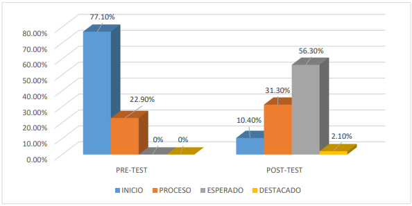 Tal como se observa en la tabla 1, se evidencia un incremento de la media entre el Pre Test de 8.188 al Post Test de 14.021 después de la aplicación de las 16 sesiones de aprendizaje con el modelo ARTE, considerando las categorías de los niveles de logro según MINEDU (Ministerio de Educación del Perú) establecidas según: 0 - 10: Inicio; 11-13: Proceso; 4-17: Esperado y 18-20: Destacado, obtendríamos los siguientes resultados categorizados.
