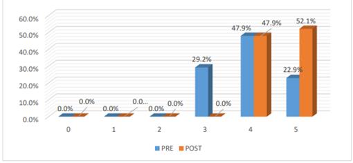 En la figura 2, se muestra que de 5 puntos posibles de obtener en la dimensión Comprensión del problema, en el Pre Test el 29.3% de alumnos obtuvieron 3 puntos, 47.9% 4 puntos, y sólo el 22.9% 5 puntos; entre tanto, posterior a la aplicación del Post Test usando el modelo de sesión de aprendizaje ARTE, el 47.9% obtuvieron 4 puntos y el 52.1%, 5 puntos, mostrándose un incremento evidente y significativo en las calificaciones.