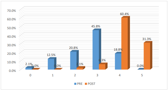 La figura 1, muestra un incremento significativo entre las calificaciones del Pre y Post Test, verificados en la aparición de los niveles Esperado y Destacado.