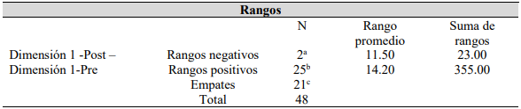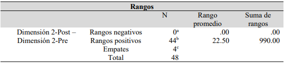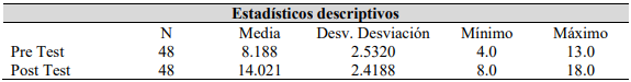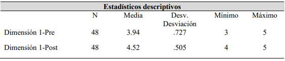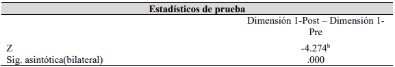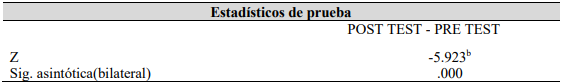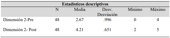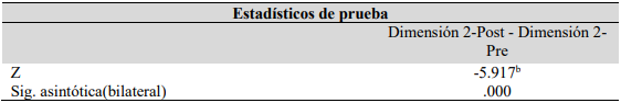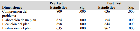 Al analizar los resultados del p valor en el Pre Test y Post Test (Tabla 4), se observa que p=.000, en las cuatro dimensiones. Por lo tanto, se concluye que los datos no siguen una distribución normal. Debido a esta razón, se debe aplicar estadística no paramétrica.