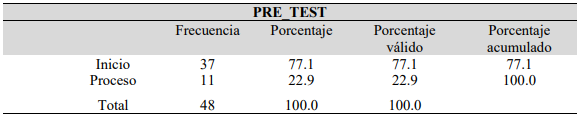 En el Pre Test, según la Tabla 2, las calificaciones determinan solo dos niveles de logro, en Inicio y Proceso, un 77.1% de ellos se encuentra en el nivel de Inicio mientras que solo el 22.9% se ubican en el nivel de Proceso