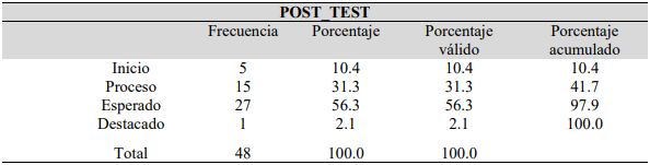 Después de aplicar las sesiones de aprendizaje con el modelo ARTE, según Tabla 3, las calificaciones se distribuyen en los 4 niveles de logro, reduciendo significativamente el nivel de Inicio con un 10.4%, además aparecen los niveles más altos de desempeño, como el nivel Esperado con un 56.3% y el nivel Destacado con un 2.1%.