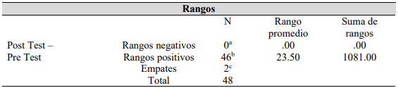 El test de Rangos de Wilcoxon presentada en la Tabla 5, nos muestra que ningún estudiante en el Post Test obtuvo una calificación inferior a la del Pre Test, que 46 estudiantes obtuvieron calificaciones en el Post Test superiores a la del Pre Test y que solo 2 de ellos obtuvieron iguales calificaciones en el Post Test y el Pre Test, lo que nos muestra que existe un incremento en las calificaciones después de haber aplicado las sesiones de aprendizaje con el modelo ARTE.
