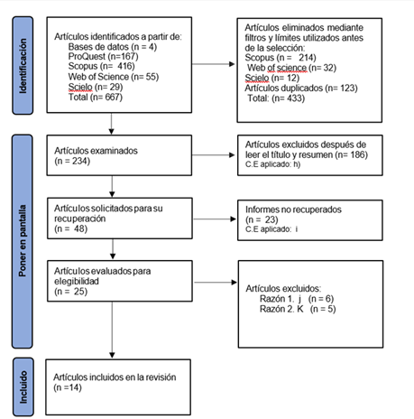 Durante la búsqueda preliminar, se hallaron registros en las revistas ProQuest 167, Scopus 416 Web Of Science 55 y Scielo 29, lo cual representó un total de 667 publicaciones en estas plataformas. Utilizando el filtro para eliminar artículos y dando el límite, quedaron de la revista ProQuest 52, Scopus 214, Web Of Science 32, Scielo 12, haciendo un total de 433 artículos eliminados, por lo tanto, quedando 234 artículos examinados, luego se excluye según el título y la verificación de resúmenes, se elimina 186 publicaciones, quedando 48 publicaciones, luego se analizan los artículos completos, eliminándose a 23 publicaciones, quedando 25 artículos elegibles, luego fueron excluidos 11 publicaciones por no cumplir con la elegibilidad quedando finalmente 14 artículos, que cumplen con los criterios de inclusión.