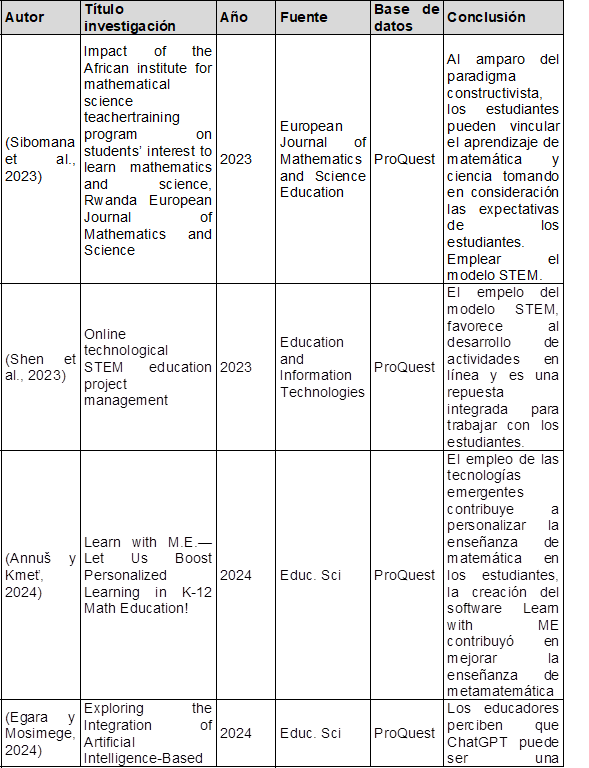 El tercer tópico de coincidencia fue el empleo de tecnologías emergentes como estrategia amigable y lúdica en curso de matemática (Annuš y Kmeť, 2024), por ejemplo, Bouzid et al. (2021) sostuvieron que, el enforque informático debe ser aprovechado para la enseñanza de matemática, incluir la gamificación también resultad divertido para los estudiantes porque los juegos hacen puedan asimilar mejor los contenidos. Para Alshehri (2024) la tecnología ha contribuido en la autorregulación de los estudiantes y esto se ha evidenciado con el uso de los libros electrónicos. Su y Chen (2024) y Shen et al. (2023) coincidieron que empelar STEM en línea e incluir la IA favorece al desarrollo de las competencias en esta área. Egara y Mosimege (2024) los autores determinaron que, el ChatGPT puede ser una herramienta útil para apoyar la instrucción de matemáticas, ofreciendo explicaciones claras y ejemplos adicionales.