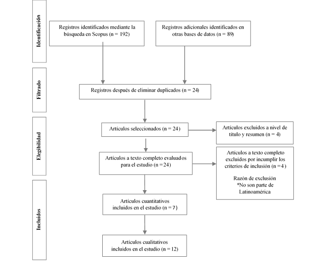 Se ubicaron en la exploración un total de 281 artículos en las bases de datos (Fig. 1), de los cuales 192 corresponden a la base de datos de Scopus y 89 a las otras dos bases. En el caso de la exclusión, se utilizaron los criterios de duplicidad, excluyendo 178 y 59 fueron excluidas por no ser artículos científicos; como resultado quedaron 119, de este total 95 no correspondían a la temática; de los 24 artículos, 4 pertenecen a otros continentes. Entonces, de los artículos seleccionados sólo 20 artículos cumplían con los criterios de inclusión.