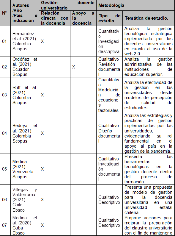 Los artículos fueron almacenados en el gestor de información Mendeley, lo que permitió su disponibilidad y análisis. Este estudio permitió identificar los alcances y avances sobre la gestión de los docentes universitarios, como un desafío de la educación superior, para mejorar la calidad y el logro de los objetivos de la institución universitaria.