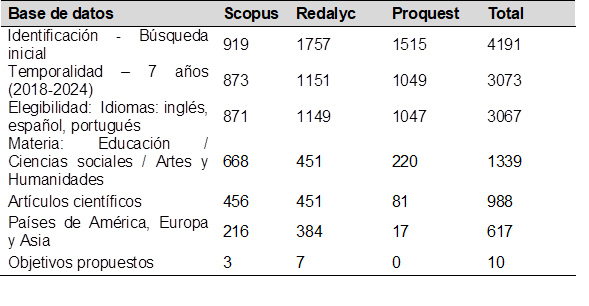 Para encontrar los artículos exactos, se realizaron una serie de criterios de inclusión y exclusión. El primer criterio fue que los artículos tengan una temporalidad de 7 años como máximo, por lo cual deben estar entre los años 2018 y 2024. El segundo criterio fue incluir los artículos de inglés, portugués y español. El tercer criterio fue solo incluir materias como educación, ciencias sociales, así como artes y humanidades. El cuarto criterio fue excluir todas las investigaciones como monografías, ensayos, libros, capítulos de libros, y tesis doctorales, incluyendo solamente a las revistas científicas. El último criterio fue incluir a los países de América como, por ejemplo: Estados Unidos, Perú, Chile, Argentina, Colombia, México; países de Europa como España y países de Asía como Japón, China, Malasia entre otros. Cabe destacar que se descartaron los artículos duplicados en cualquiera de las tres bases de datos.