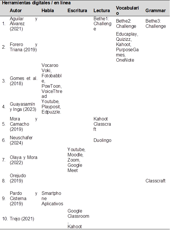 De acuerdo con el análisis desarrollado en los diez artículos se presentan los principales resultados sobre las herramientas digitales para el desarrollo de habilidades productivas en el aprendizaje del inglés.