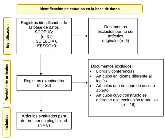 En el marco de la metodología de esta revisión sistemática, se llevó a cabo la extracción de artículos de tres bases de datos fundamentales: Scopus, Scielo y EBSCO. Para Scopus, se implementó una búsqueda especializada en inglés utilizando la fórmula detallada "(TITLE-ABS-KEY("artificial intelligence") AND TITLE-ABS-KEY("formative assessment" OR "Formative evaluation")) AND (LIMIT-TO(OA, "all")) AND (LIMIT-TO(SRCTYPE, "j")) AND (LIMIT-TO(LANGUAGE, "English")) AND (LIMIT-TO(DOCTYPE, "ar"))". A pesar de no obtener resultados en Scielo y EBSCO para el idioma español, Scopus emergió como la fuente principal, destacando su importancia en brindar información actualizada y relevante en la intersección crítica entre inteligencia artificial y evaluación formativa en la investigación académica internacional.