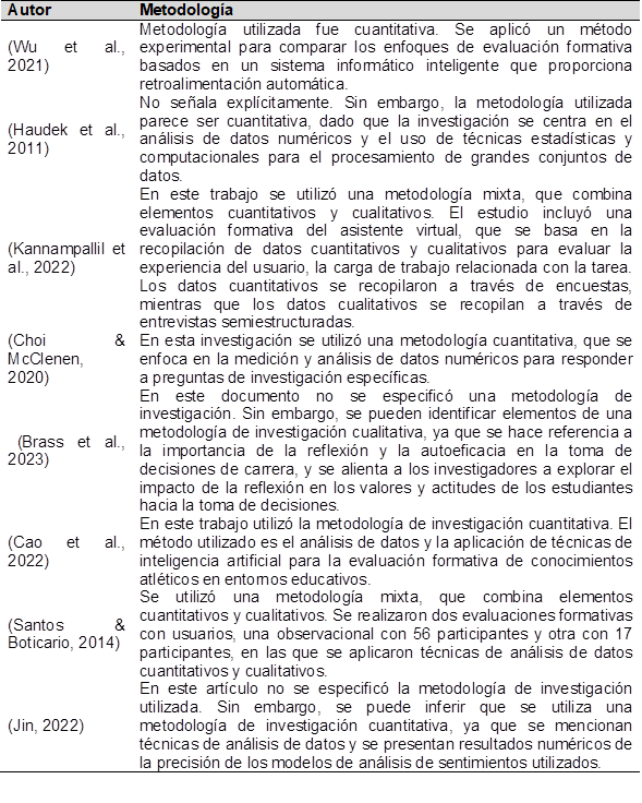 En la Tabla 1, permitió inferir que Wu et al. (2021) y Haudek et al. (2011) adoptaron enfoques cuantitativos para evaluar sistemas informáticos inteligentes. Mientras que, Kannampallil et al. (2022) y Santos & Boticario (2014) destacaron la importancia de metodologías mixtas, integrando datos cuantitativos y cualitativos en evaluaciones formativas. A su vez, Choi & McClenen (2020) y Cao et al. (2022) optaron por metodologías cuantitativas, centradas en mediciones numéricas. Brass et al. (2023) presentó un vacío al no especificar su metodología, aunque sugiere elementos cualitativos. Jin (2022) también carece de claridad, pero se infiere una metodología cuantitativa. Se destacó la necesidad de mayor transparencia en Brass et al. (2023) y Jin (2022), al no señalar una metodología clara y completa para fortalecer la validez y aplicabilidad de los estudios en evaluación formativa con inteligencia artificial.