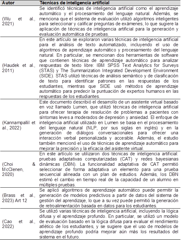 Tabla 2 Técnicas de inteligencia artificial utilizados en los documentos analizados