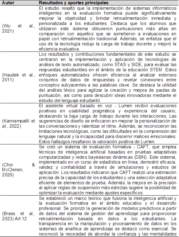 Asimismo, este trabajo ofrece contribuciones significativas al campo de la evaluación formativa educativa mediante la síntesis crítica de estudios previos. Destaca la diversidad metodológica observada, abarcando enfoques cuantitativos, mixtos y cualitativos, proporcionando una visión integral de las estrategias utilizadas en la evaluación de sistemas informáticos inteligentes. Además, resalta la versatilidad de las técnicas de inteligencia artificial empleadas, desde aprendizaje automático hasta procesamiento del lenguaje natural, subrayando la riqueza de herramientas disponibles. Los impactos positivos identificados, como la mejora en la objetividad y la retroalimentación personalizada, ofrecen perspectivas valiosas sobre la eficacia de la integración de la IA en la evaluación.