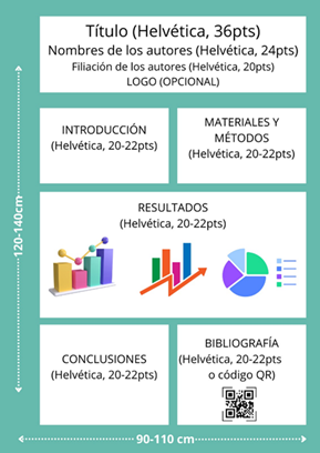El tamaño y dimensiones: Respecto del tamaño y dimensiones, éstas varían en dependencia de las políticas y requisitos impuestos por los diferentes eventos científicos en los que se pretende presentar un póster científico. Actualmente, se realizan presentaciones en pantallas digitales, que facilitan la disertación y defensa de los mismos. Sin embargo, una medida recomendable para posters impresos sería de 120-140 cm de alto por 90-110 cm de ancho. Esta medida es aplicable, tanto si el póster se presenta de forma vertical u horizontal. (Guardiola, 2002; Bravo-Ramos, 2007; Antón et al., 2016; Ros-Navarret, 2019).
