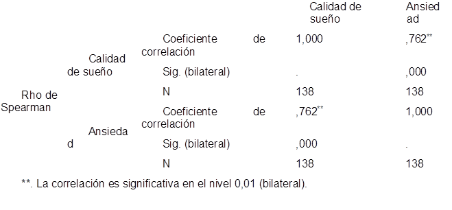 Por lo que la relación entre la ansiedad y calidad de sueño en profesores analizadas en este estudio fue de Rho = 0,74, (P<0.05), encontrándose hallazgos concluyentes de una relación positiva entre las variables de estudio, esto implica que la ansiedad puede tener un impacto significativo en la calidad del sueño y puede dar lugar a una serie de consecuencias negativas para la salud y consecuentemente en el ámbito laboral (Chen et al., 2023; A. Zúñiga et al., 2021). Los estudios indican que la ansiedad está directamente asociada a la dificultad para conciliar el sueño (Zúñiga et al., 2021). Las personas con ansiedad a menudo tienen dificultades para apagar sus mentes y relajarse lo suficiente como para conciliar el sueño. Esto puede llevar a largos períodos de tiempo despiertos en la cama antes de quedarse dormidos (Choquez-Millan y Soto, 2023; A. Zúñiga et al., 2021).