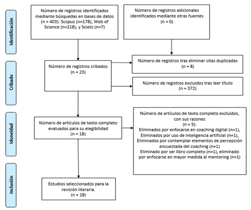 Criterios de inclusión: Tratarse de artículos científicos publicados en revistas científicas indexadas a las bases de datos Scopus, Scielo y Web of Science, enmarcados en el coaching aplicado a la educación superior que justifiquen su investigación en los resultados de su aplicación, que se hayan publicado entre 2023 y 2024, que tengan la categoría de libre acceso, se considerarán libros de referentes en el tema sólo para el marco conceptual.
