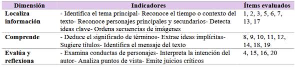 La evaluación de los estudiantes se basó en tres dimensiones de la comprensión lectora: localizar información, comprender y evaluar/reflexionar, detallados en la tabla 1: