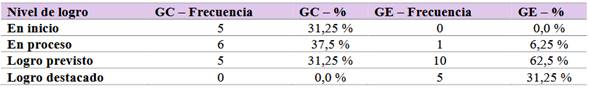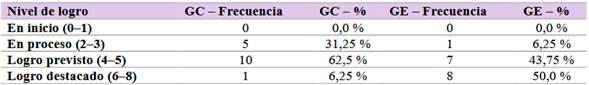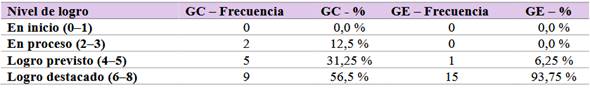 En la prueba de salida, el GC presentó el siguiente desempeño: 0 % de estudiantes se ubicó en el nivel “en inicio”, 12,5 % en “en proceso”, 31,25 % alcanzó el “logro previsto” y 56,25 % logró el “logro destacado”. En cambio, en el GE, el 93,75 % de los estudiantes logró el nivel "logro destacado", y solo un 6,25 % se ubicó en el nivel “logro previsto”, sin registros en los niveles inferiores. Estos datos reflejan una mejora sustancial en el GE.