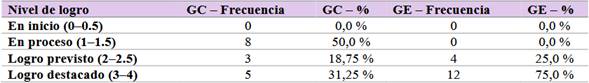 Los resultados de la prueba de salida muestran que, en el GC, el 31,25 % de los estudiantes permaneció en el nivel “en inicio”, el 37,5 % se ubicó en “en proceso”, y el 31,25 % logró alcanzar el “logro previsto”. Ningún estudiante alcanzó el “logro destacado”.