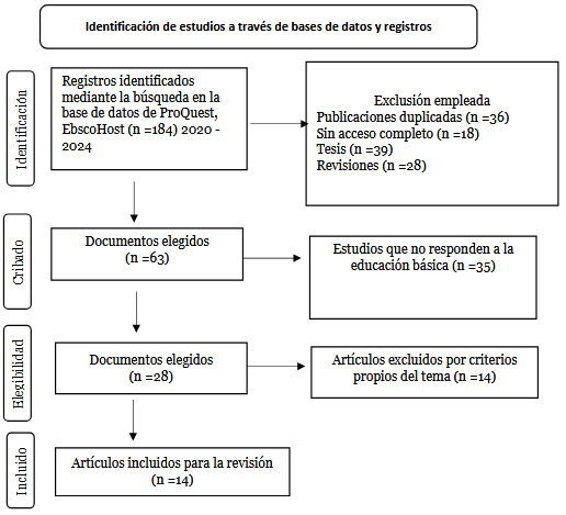 Conforme al criterio de inclusión se tomaron en cuenta estudios publicados entre el 2020 al 2024 correspondientes a la educación básica. Asimismo, se consideró los estudios que tengan acceso libre y hayan sido publicados en español. En cuanto a la exclusión de los artículos se consideraron los estudios enfocados en la educación superior o universitaria Así mismo que no estén dentro de los años consignados y la publicación corresponda a otro idioma que no sea el español.