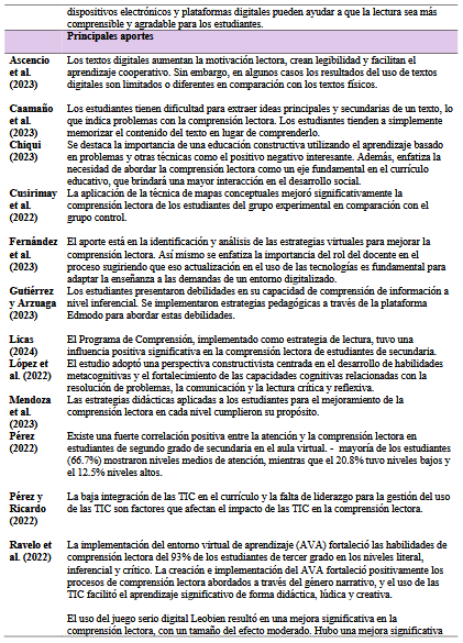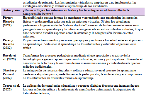 En cuanto a la interrogante sobre la influencia de los entornos virtuales y las tecnologías en el desarrollo de la comprensión lectora, en la tabla 1 se muestran algunos aportes de los artículos analizados.