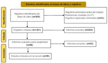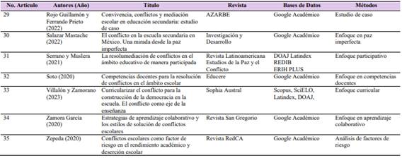 Los resultados de búsqueda en las bases de datos SciElo, Redalyc, Ebsco y Dialnet permitieron identificar un total de 309 artículos relacionados con la resolución de conflictos en escuelas. Por conceptos de referencias cruzadas y artículos duplicados antes del cribado se eliminaron 48 artículos, sometiéndose al cribado 261 artículos. Posteriormente, durante el cribado se descartaron 203 investigaciones por estar fuera del rango de tiempo definido encontrarse fuera del contexto de la investigación. Por último, considerando el título y el resumen, se seleccionaron 58 trabajos. De estos, se excluyeron 23 artículos por presentar un enfoque anecdótico. Como resultado se seleccionaron 35 artículos para la revisión, estos se relacionan en la Tabla 1.