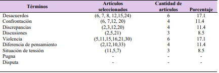 El análisis de los artículos revisados revela que los términos más frecuentes para describir conflictos escolares fueron "desacuerdos" y "violencia", presentes cada uno en 6 artículos (17.1% del total). Le siguen en frecuencia "confrontación" y "discrepancias", mencionados en 4 artículos cada uno (11.4%), mientras que "discusiones" (3 artículos, 8.5%) y "diferencia de pensamiento" (4 artículos, 11.4%) aparecieron con menor recurrencia. El término "situación de tensión" fue utilizado en 3 estudios (8.5%). Es notable que conceptos como "pugna" y "disputa" no fueron empleados en ninguno de los trabajos analizados, lo que sugiere que estas expresiones no forman parte del vocabulario académico predominante en las investigaciones sobre conflictos en el ámbito escolar.