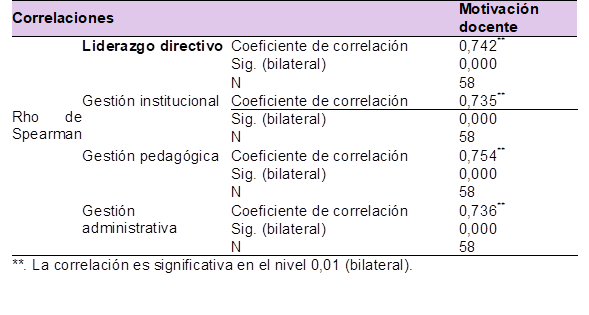 Los resultados estadísticos expuestos en la Tabla 1, indican una correlación positiva y significativa entre el liderazgo directivo y la motivación docente, con un coeficiente Rho de Spearman de 0.742 y un valor de significancia p < 0.01. Este coeficiente refleja una relación directa de intensidad alta, donde un mayor ejercicio del liderazgo directivo se asoció con niveles superiores de motivación en el profesorado. El nivel de significancia estadística (p < 0.01) implica que hay menos del 1% de probabilidad de que los resultados sean producto del azar, lo que otorga solidez y confiabilidad a las conclusiones obtenidas.
