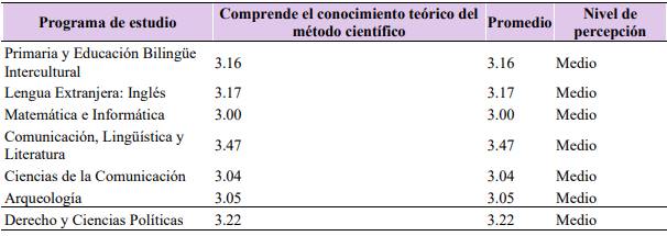 En términos comparativos, el programa de Comunicación, Lingüística y Literatura obtuvo el promedio más alto (3.47), reflejando una apropiación conceptual más sólida del método científico, posiblemente vinculada con la orientación investigativa de su plan de estudios. En cambio, el programa de Matemática e Informática registró el promedio más bajo (3.00), lo que evidenció limitaciones en la comprensión teórica de la investigación y la necesidad de fortalecer la formación metodológica en este ámbito.