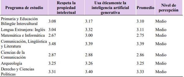 El análisis de la dimensión actitudinal evidenció que todos los programas de estudio se situaron en un nivel de percepción medio Tabla 3. Si bien los estudiantes manifestaron actitudes favorables hacia el respeto por la propiedad intelectual y la originalidad de los resultados, los niveles alcanzados indicaron que el comportamiento ético durante el proceso de investigación y el uso responsable de la inteligencia artificial generativa (IAG) requerían ser reforzados.