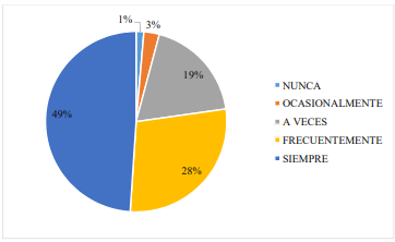 En cuanto al trabajo en equipo, el 27% de los encuestados indica que siempre hay colaboración entre los compañeros, mientras que el 35% responde que esto ocurre frecuentemente. No obstante, un 4% considera que el trabajo en equipo es ocasional, un 1% dice que nunca hay trabajo colaborativo y un significativo 33% se muestra indeciso. Esta indecisión podría reflejar dudas sobre la efectividad del trabajo colaborativo o señalar dificultades significativas en su desarrollo.