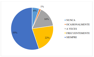 En cuanto al reconocimiento por parte de los compañeros se muestra en la figura 2, un 55% se siente siempre satisfecho, lo que es un indicador positivo del ambiente colaborativo. Sin embargo, un 22% lo percibe frecuentemente, un 1% como ocasional, un 16% se muestra indeciso y un 6% expresa insatisfacción. Esto podría señalar áreas a explorar para fomentar una cultura de apoyo mutuo. Actividades como reconocimientos mensuales o programas de mentoría podrían ser útiles.