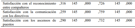 El análisis de correlación se detalla en la Tabla 2 mientras el nivel de interacción se detalla en la Tabla 3, si se promedian los valores contenidos, se tiene un 70% de correlaciones válidas. Lo cual permite concluir que la hipótesis principal de la presente tesis es válida. Es decir, que existe una relación directa entre el clima organizacional y el desempeño laboral de los trabajadores del Hospital Civil Santa Teresita